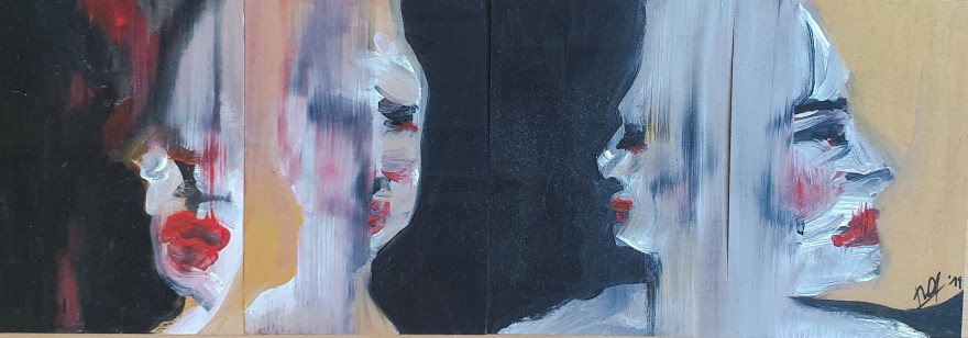 2019 „Diskurs“, Acryl auf Holz, 4 Teile, 60 x 21 cm „Ohne Titel“, Acryl und Sand auf Leinwand, 100 x 70cm